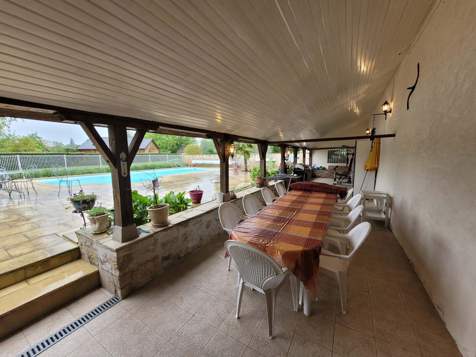 EN extérieur, une pergola de 45m2 couverte en tuiles de pays,donne directement sur une terrasse de150 m2 avec une magnifique piscine (11 par 5)chauffée' par une pompe à chaleur récente (2024). Coté pratique, un garage, un atelier, le tout sur un terrain arboré de 4000 m2.