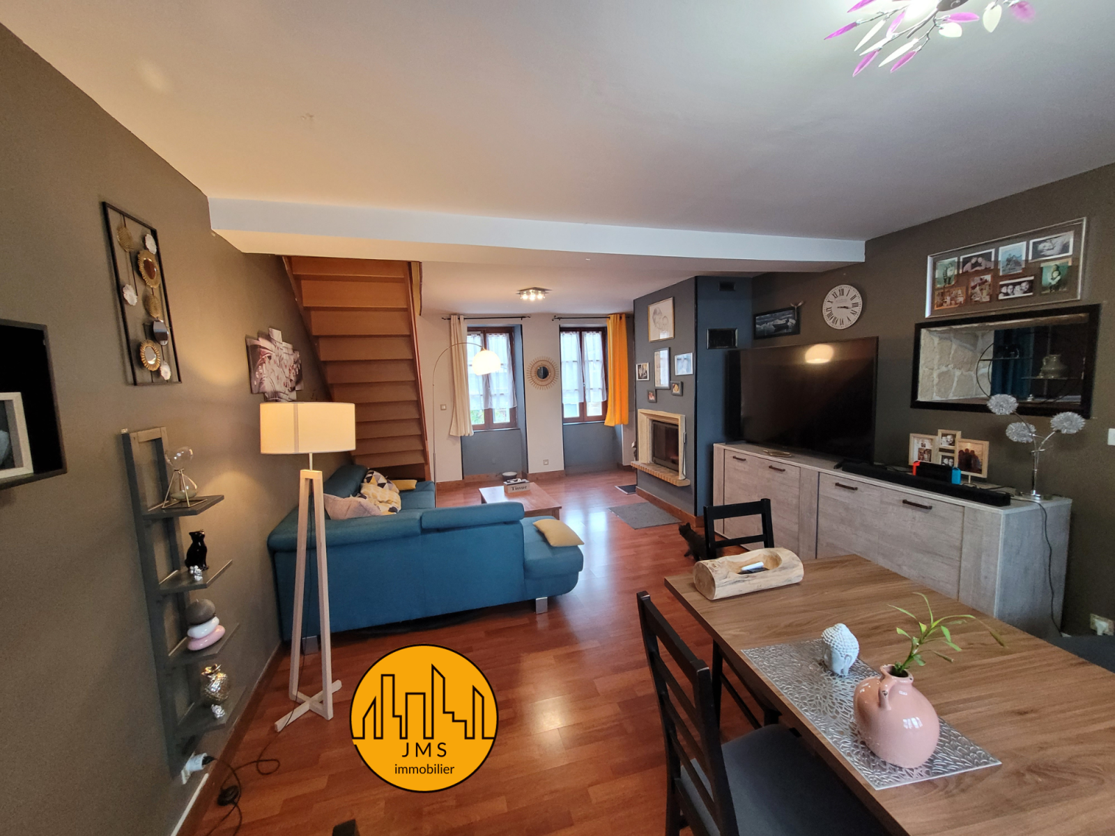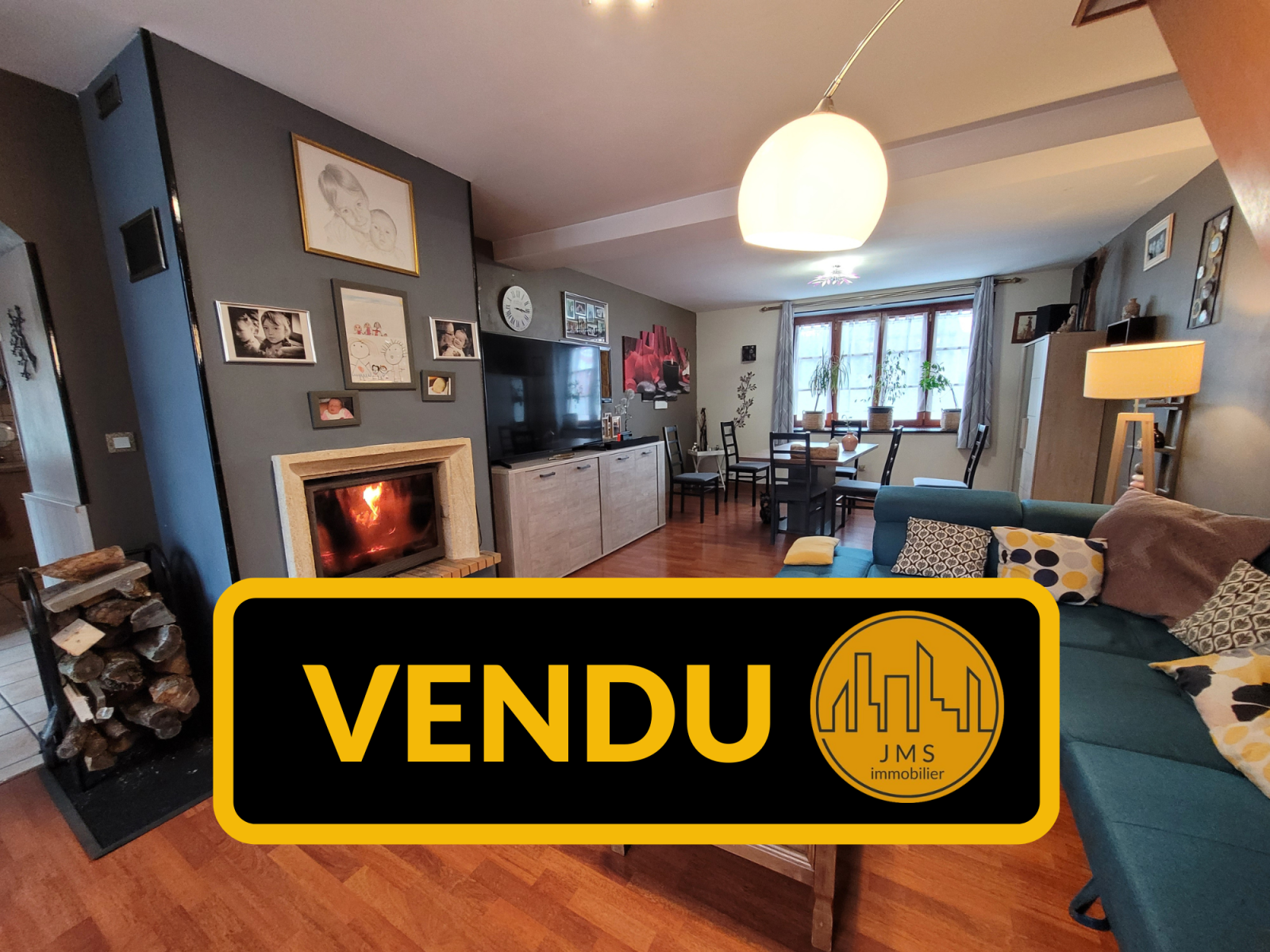 Rez-de-chaussée, un beau séjour avec insert, une cuisine équipée, une chambre et un wc.